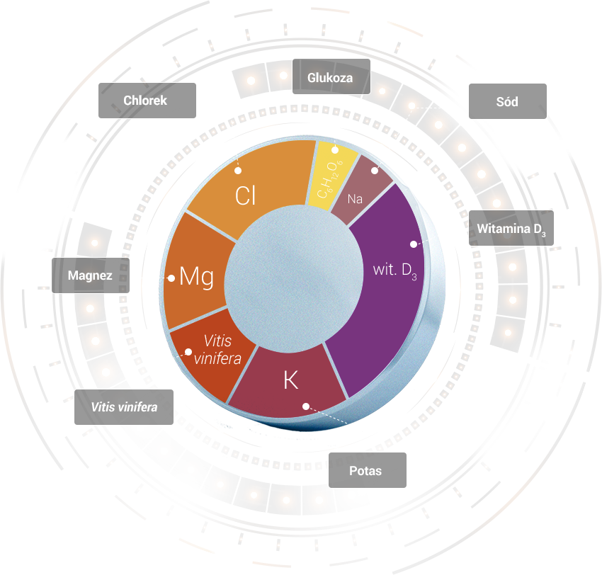 1 tabletka zawiera: 1000 j.m. witaminy D3, 250 mg potasu (cytrynian potasu, chlorek potasu, wodorowęglan potasu), 100 mg glukozy (bezwodnej), 100 mg sodu (wodorowęglan sodu), 80 mg chloru (chlorek potasu), 40 mg magnezu (cytrynian magnezu), 10 mg wyciągu z pestek winogron Vitis Vinifera.